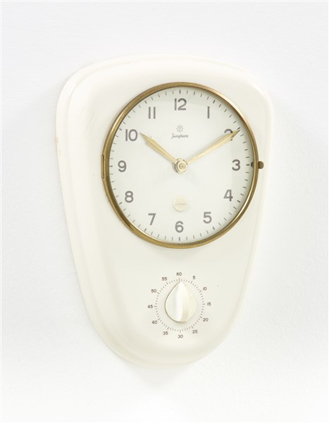Orologio da cucina con timer modello "Küchenuhr". Produzione Junghans, Germania, anni '50/'60. Ceramica créme smaltata. Recante marchio del produttore. (cm 20x28) (lievi difetti, meccanismo non originale)
