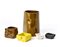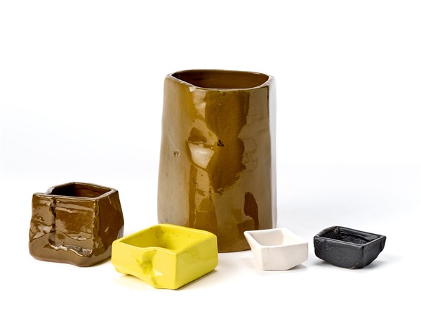 Lotto composto da cinque vasi di diverse dimensioni in ceramica lavorata a mano e smaltata in bianco, marrone, nero e giallo. Manifattura Danese, Milano, fine anni '50. I tre vasi maggiori recanti il marchio della manifattura e le iniziali dell'artista. (h max cm 15) (difetti)