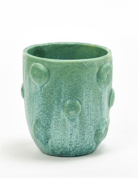 Vaso decorato con bugne modello "2495". Manifattura Società Ceramica Italiana, Laveno, anni '30. Ceramica smaltata verde. Recante simbolo grafico della manifattura sotto la base. (h cm 14) (difetti)