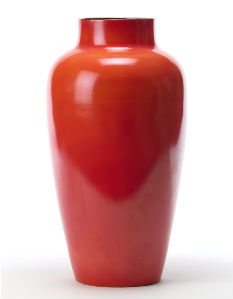 Vase model "Olandese 3". Manufacture of Società Ceramica Italiana, Laveno, 1950s. Strong earthenware cast-formed, decorated with red and black enamel. Marked with the numeral 5-32 and with the manufacturing symbol in green under the base. (h 56.5 cm.) (slight defects)