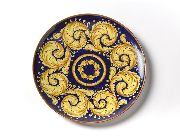 Ceramic plate decorated with acanthus spirals on a blue background. Milan, 1920s. Marked on the back. (d 44.5 cm.) (slight defects)