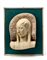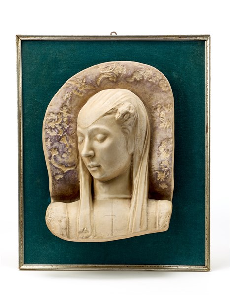 High-relief in glazed ceramic in opaque beige and with a slight metallic luster, depicting a female half bust. Faenza, 1950s/1960s. Signed on the right side "P. MELANDRI" and mounted on a panel with frame. (h high relief cm 38)