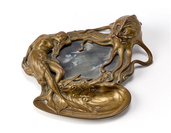 Calamaio in fusione di bronzo a soggetto marino simbolico. Contenitore per l'inchiostro in pasta vitrea bianca. Austria, inizio secolo XX. (cm 21x23)