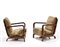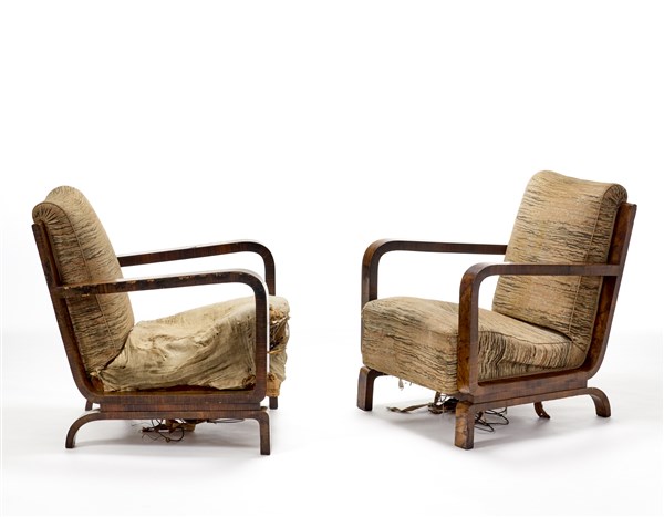 Lot consisting of two Novecento armchairs in briar-veneered wood with seat and back upholstered in multicolored fabric. Italy, 1930s. (62.5x78x70 cm.) (major defects)