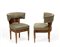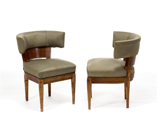 Coppia di poltroncine da camera Novecento con struttura in legno massello e impiallacciato, seduta e schienale imbottiti e rivestiti in tessuto verde, gambe tornite. Italia, anni '30. (cm 56x71x53) (difetti)