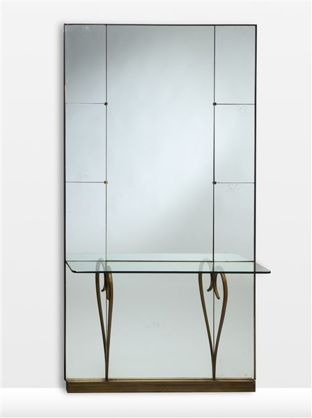 Large mirror with console. Lissone, 1953. Glass top and wavy brass uprights, base covered in brass foil, wooden frame. Bearing production label. Marked and dated "DECEMBER 1953". (110x210 cm.) (slight defects)