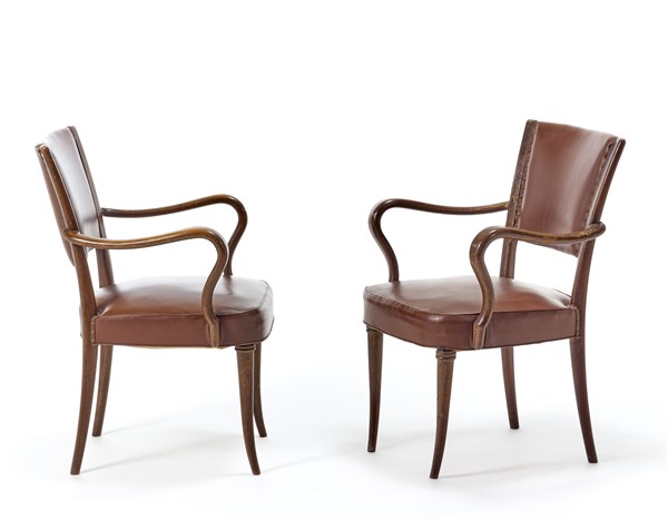 Coppia di poltroncine in legno massello con seduta e schienale imbottiti rivestiti in similpelle bordeaux. Italia, anni '40. (cm 64x89x62) (difetti)