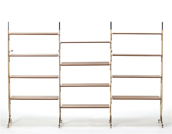 Libreria a tre campate con montanti in acciaio verniciato nero e legno rivestito in similpelle con piedi in ottone massello. Dodici ripiani regolabili in altezza in legno impiallacciato. Italia, anni '60. (cm 252x171x41) (lievi difetti)
