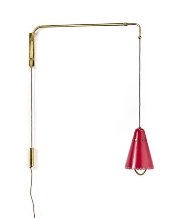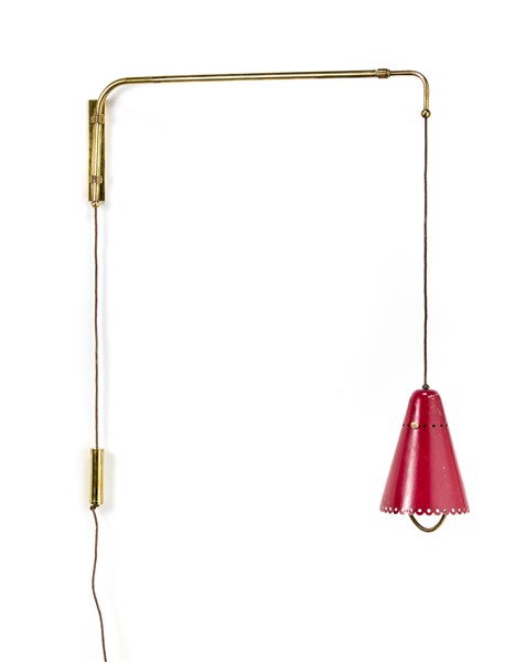 Lampada da parete a contrappeso con braccio orientabile e allungabile, struttura in ottone e paralume verniciato rosso. Italia, anni '50. (l max cm 115) (lievi difetti)