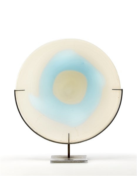 Circular spark arrester in lattimo and blue glass. Murano, 1970s. Mounted on a metal support with the author's signature. (d 56.5 cm.) (slight defects)