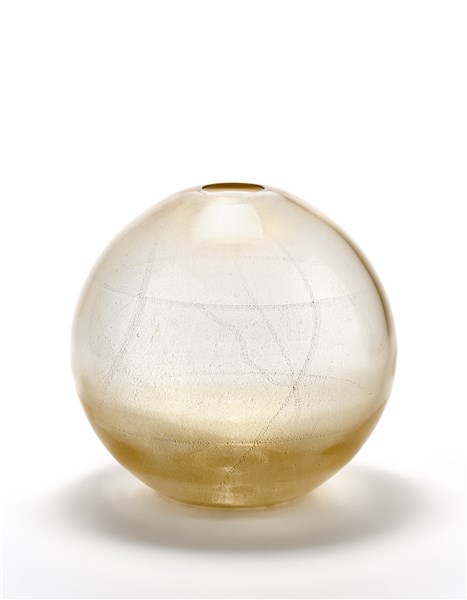 Vaso globulare modello "g. S495". Esecuzione Mazzega, Murano, anni '70. Vetro soffiato trasparente incolore con inclusione di foglia d'oro. Orlo molato. (h cm 24) (lievi difetti)
