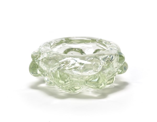 Colorless transparent glass ashtray with inclusion of irregular bubbles. Murano, 1940s. (h 4.5 cm.; d 13 cm.)