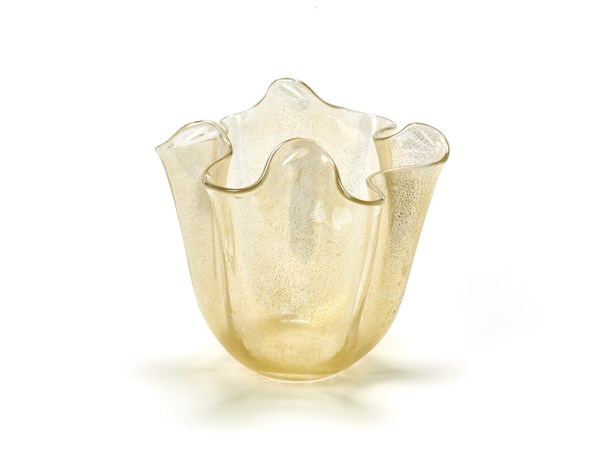Vasetto a fazzoletto in vetro soffiato trasparente incolore con inclusione di foglia d'oro. Esecuzione Venini, Murano, anni '40. Firmato all'acido sotto la base. (h cm 9,5)