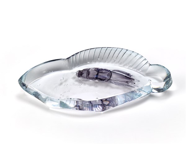 Scultura in vetro sommerso con inclusione di paste vitree di vari colori. Murano, 1993. Dedicata, firmata e datata a punta. (cm 6,5x39x18)