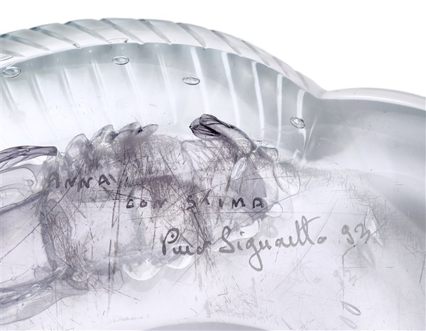 Sommerso glass sculpture with inclusion of glass pastes of various colors. Murano, 1993. Dedicated, signed and dated. (6.5x39x18 cm.)