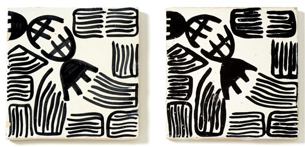 Due mattonelle in ceramica decorate con motivi astratti smaltati in nero su fondo bianco. Roma, 1951-1952. (cm 20x20) (lievi difetti)