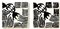 Two ceramic tiles decorated with abstract motifs glazed in black on a white background. Rome, 1951-1952. (20x20 cm.) (slight defects)