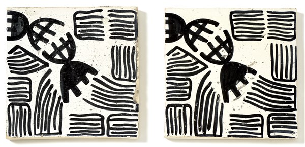 Due mattonelle in ceramica decorate con motivi astratti smaltati in nero su fondo bianco. Roma, 1951-1952. (cm 20x20) (lievi difetti)