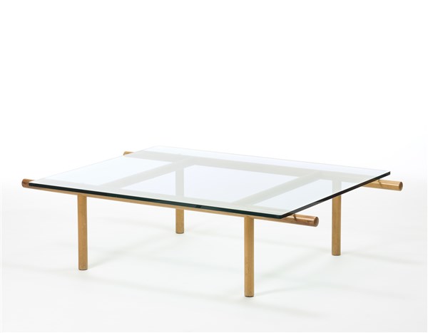 Tavolo da salotto modello "124 Veranda". Produzione Cassina, Meda, 1983. Struttura in legno di frassino naturale, piano in cristallo. Recante etichetta cartacea della produzione. (cm 140x99,5x37,5) (lievi difetti e piccole sostituzioni)