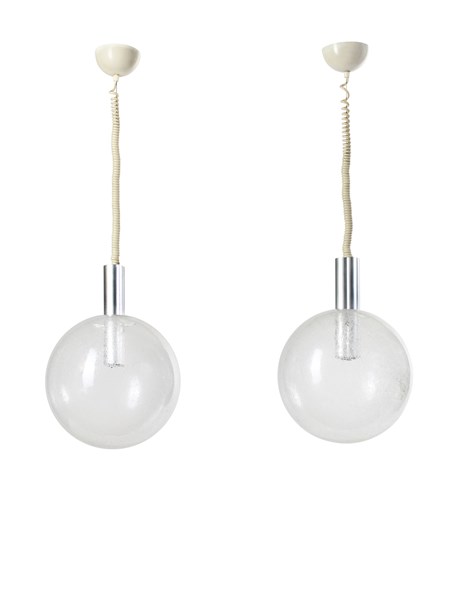 Due lampade a sospensione modello "Sfera". Produzione Flos, Milano, 1964. Alluminio e vetro soffiato incolore a bolle. (difetti)
