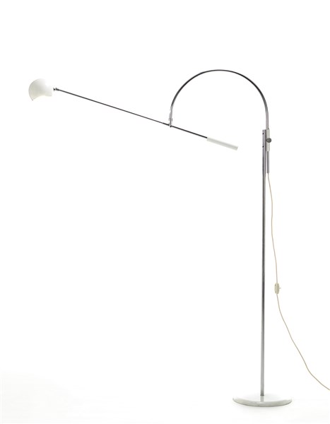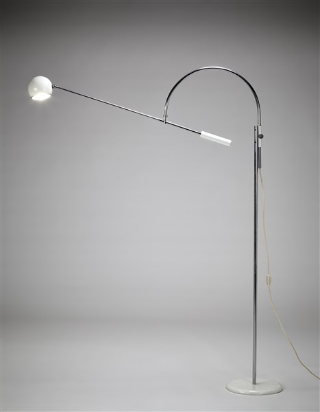 Lampada da terra modello "Orbiter". Italia, 1970. Contrappeso e base in metallo verniciato bianco, fusto in acciaio cromato e paralume sferico in metallo verniciato bianco. (h regolabile) (lievi difetti)