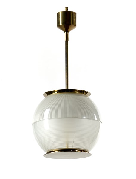 Lampada a sospensione modello "LS4". Produzione Azucena, Milano, 1955. Diffusore in due vetri abbinati e montatura in ottone lucido. (h cm 70; d cm 30) (lievissimi difetti)