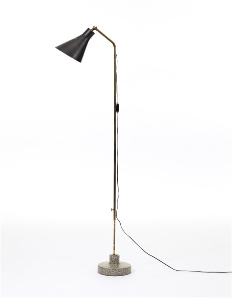 Lampada da terra modello "LTE3 Alzabile". Produzione Azucena, Milano, 1952-1955. Base tornita in granito nero e beige, stelo in ottone, paralume in alluminio laccato grigio. (altezza regolabile) (lievi difetti)