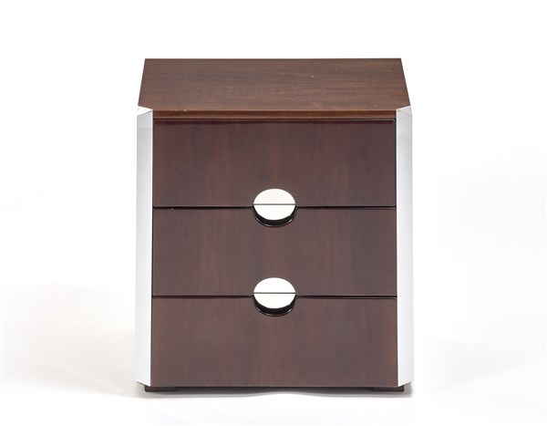 Chest of drawers with three drawers. Produced by Azucena, Milan, 1961. Solid mahogany wood, edged and veneered with inserts and corners in chromed metal. (60x58x47 cm.) (slight defects)