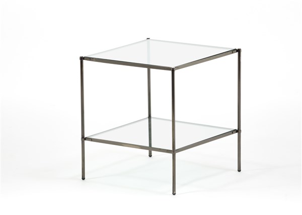 Tavolino a due ripiani modello "T12 Montecarlo". Produzione Azucena, Milano, 1959. Ottone brunito con con ripiani quadrati in cristallo molato. (cm 42x46x42) (lievi difetti)