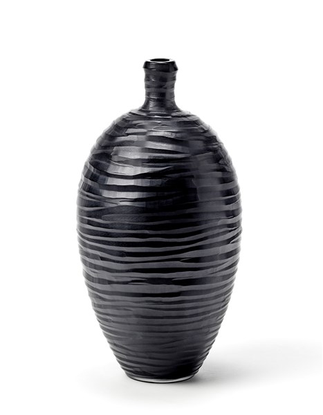 Vaso a collo stretto in vetro soffiato nero opaco, molato sulla superficie esterna con profonde incisioni orizzontali. Murano, 2002. Firmato e datato a punta sotto la base. (h cm 27)