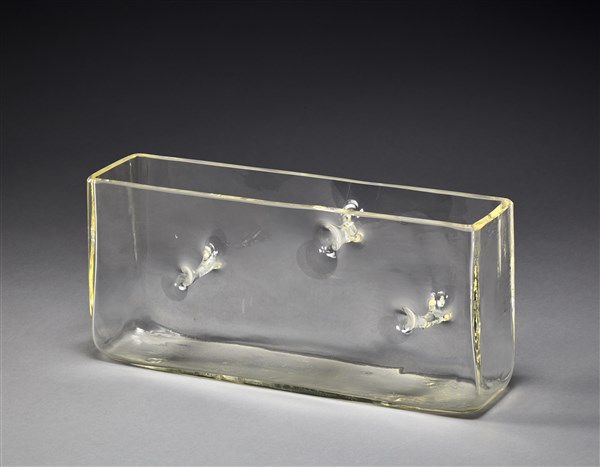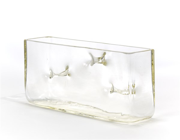 Vaso parallelepipedo della serie "Repetai". Esecuzione F.lli Toso, Murano, 1968. Vetro cristallo soffiato in stampo con pareti interconnesse da membrane passanti. (cm 31,5x14x8)