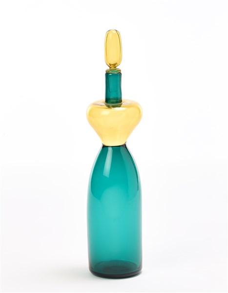 Bottiglia con tappo della serie "Gio Ponti ". Murano, 1982. Vetro trasparente verde e giallo ambra. Firmata e datato a punta sotto la base. (h cm 35)