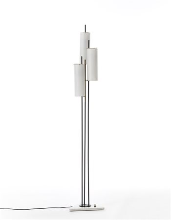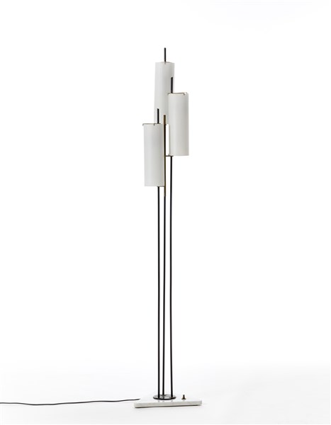 Lampada da terra a tre luci con struttura in metallo verniciato nero e ottone, diffusori in vetro incamiciato lattimo e base in marmo bianco. Italia, anni '50/'60. (h cm 176) (lievi difetti)