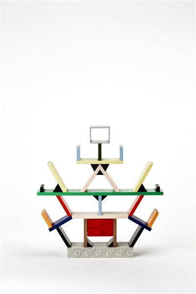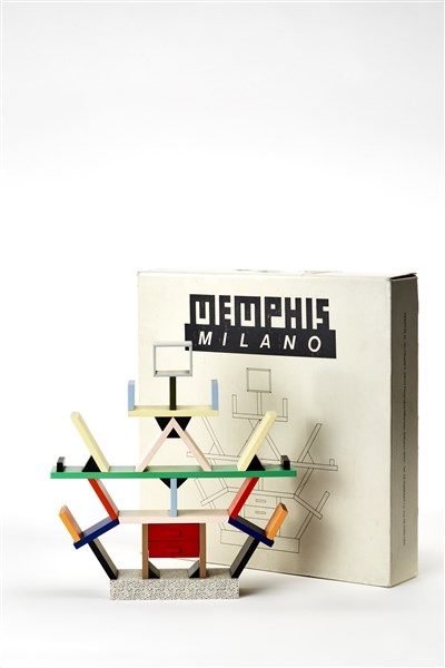 1: 6 scale model of the "Carlton" dividing unit. Memphis, Milan, 1981. Produced by Memphis, Milan, 1981. Lacquered wood, laminate. Multiple 173/500. Signed in felt-tip pen "E. Sottsass" and numbered under the base. In original box. (32x33x5 cm.)