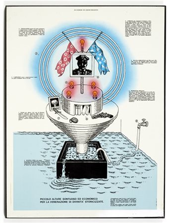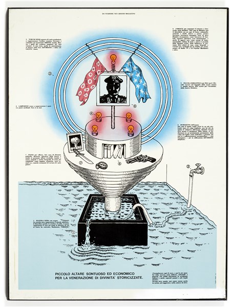 Manifesto: Piccolo altare sontuoso ed economico per la venerazione di divinità storicizzate. Edizioni Jabik Arte Moltiplicata, Milano, 1974. Rotoflessografia a colori stampata su lastra di alluminio. Multiplo numerato 147/500 e firmato al verso. (cm 76x56). In cornice. (lievi difetti)