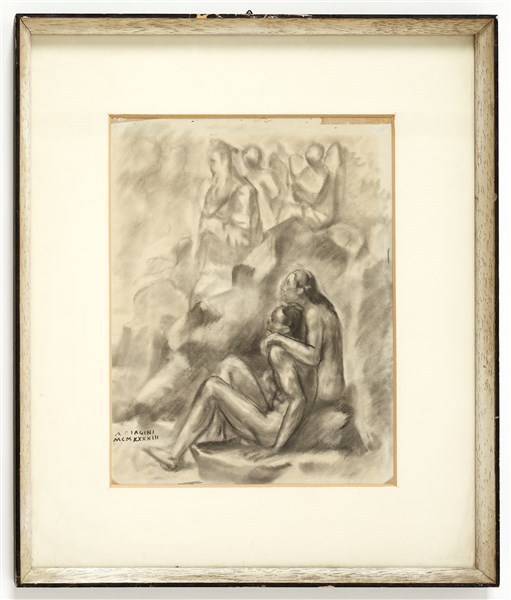 Studio per gruppo scultoreo. Roma, 1943. Matita e carboncino su carta. Firmato, datato e locato in basso a sinistra (cm 26x20). In cornice.