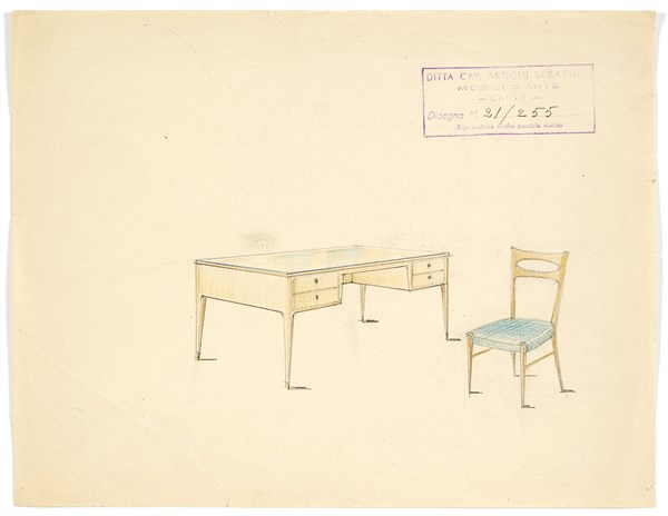 Lotto composto da due fogli con studi per una scrivania con sedia e per un mobile bar. Milano/Cantù, anni '40/'50. Matita e pastelli colorati su carta. Recanti cartiglio "Ditta Cav. Arrighi Stefano Mobili d'Arte - Cantù -". (cm 21,5x27,8; cm 27,9x21,9) (lievi difetti)