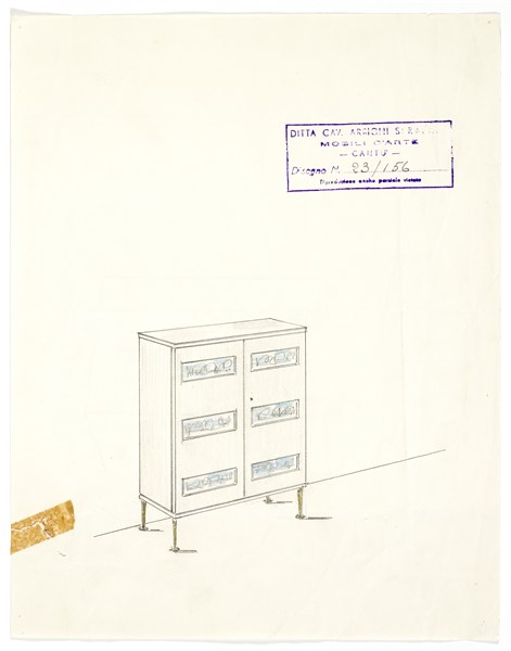 Two sheets with studies for a desk with chair and for a bar cabinet. Milan/Cantù, 1940s/1950s. Pencil and colored crayons on paper. On the cartouche "Ditta Cav. Arrighi Stefano Mobili d'Arte - Cantù -". (cm 21.5x27.8; cm 27.9x21.9) (slight defects)