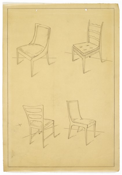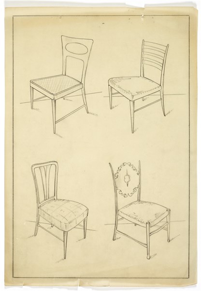 Lot consisting of two sheets with perspective drawings of eight models of chairs, among which we can recognize some models designed by Paolo Buffa. Milan/Cantù, 1940s/1950s. Pencil on dusting paper. (cm 32.8x22.9; cm 33x22.8) (slight defects)