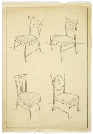 Lotto composto da due fogli con disegni prospettici di otto modelli di sedie, fra le quali si riconoscono alcuni modelli disegnati da Paolo Buffa. Milano/Cantù, anni '40/'50. Matita su carta da spolvero. (cm 32,8x22,9; cm 33x22,8) (lievi difetti)