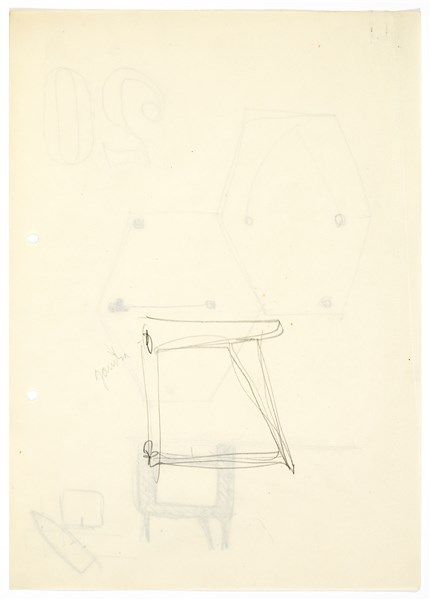 Two studies respectively for a desk and for side-by-side tables with hexagonal top. Milan, 1950s. Black and blue ink, pencil on dusting paper. Handwritten annotations by Gio Ponti. Front / back. (cm 28.1x21; cm 29.6x21) (slight defects)