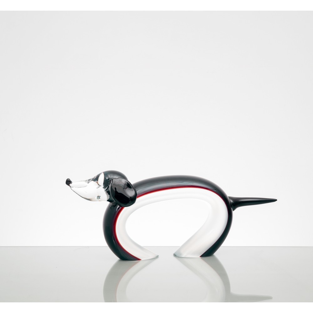Scultura di cane Bassotto in vetro sommerso trasparente e nero. Firmato.
