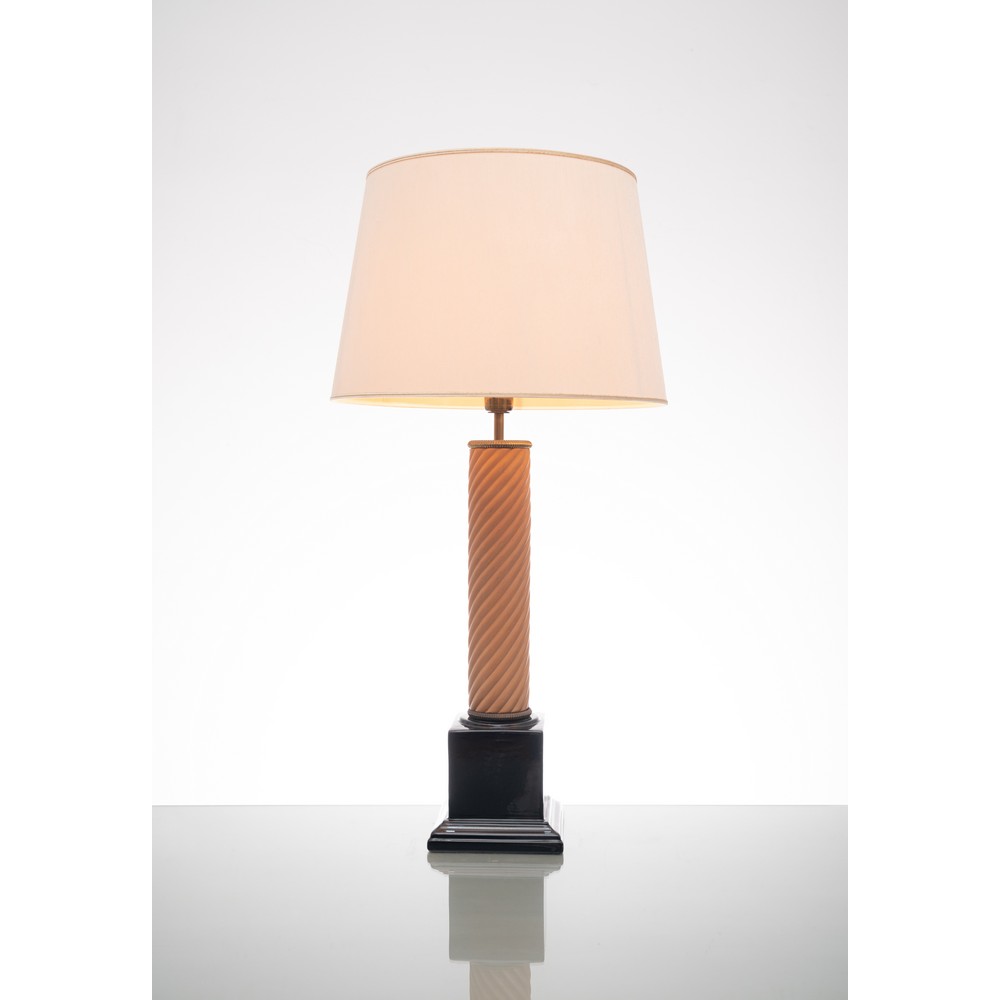 TABLE LAMP WITH ONE LIGHT IN CERAMIC, BROWN TWISTED COLUMN BODY ON BLACK BASE. LAMPSHADE IN CREAM FABRIC. PRODUCTION LABEL.