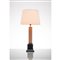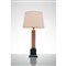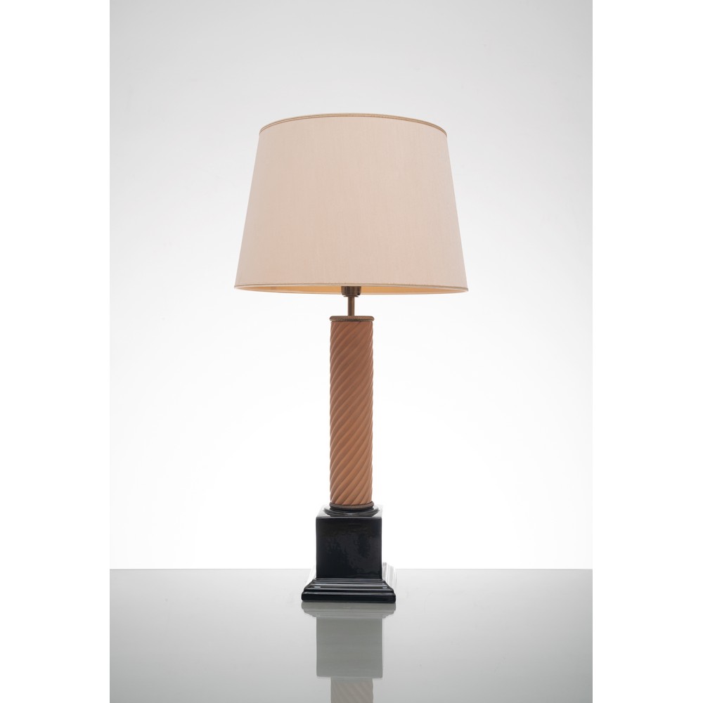 Lampada da tavolo ad una luce in ceramica, corpo a colonna tortile marrone su basamento nero. Paralume in tessuto crema. Etichetta di produzione.