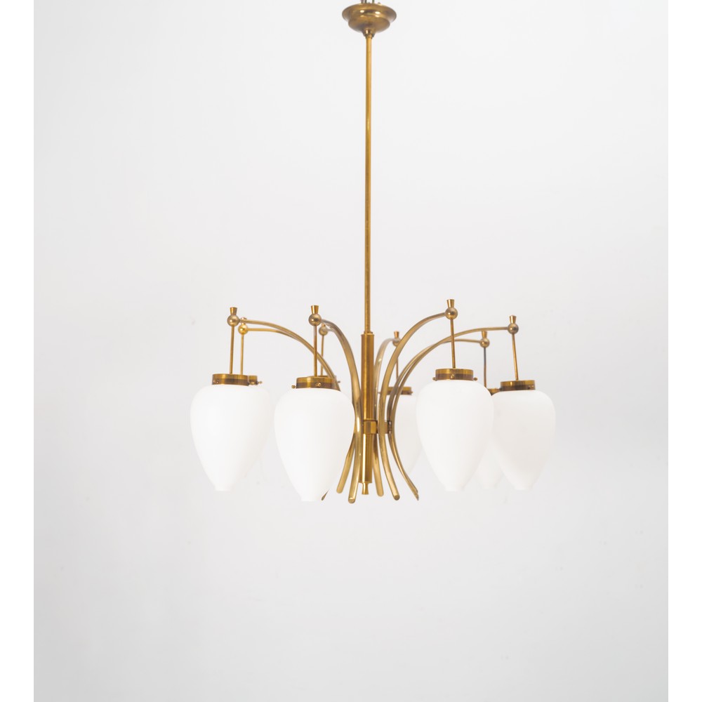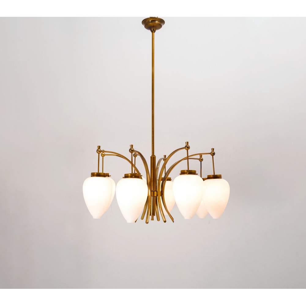 SUSPENSION LAMP WITH EIGHT LIGHTS IN BRASS WITH DROP-SHAPED DIFFUSERS IN OPAL GLASS.