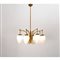Lampada a sospensione ad otto luci in ottone con diffusori a goccia in vetro opale.