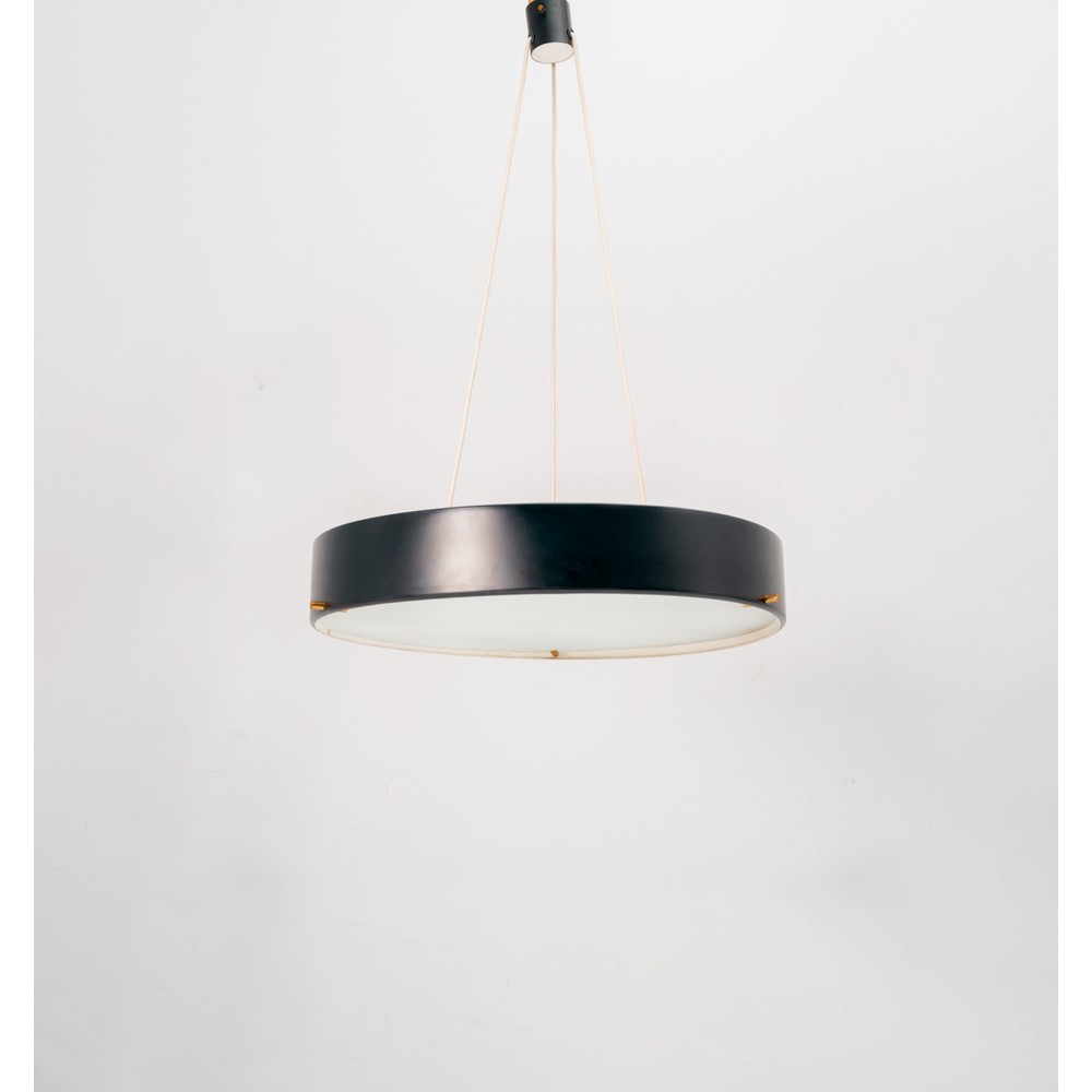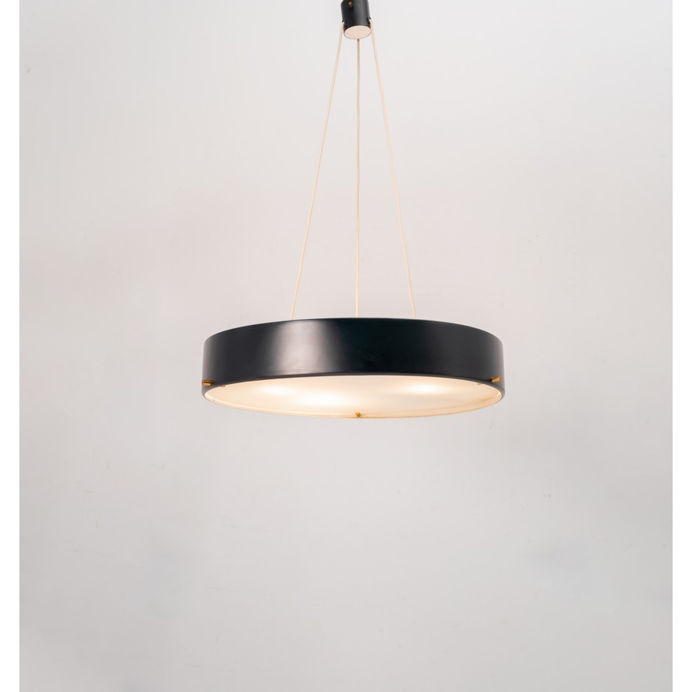 SUSPENSION LAMP MODEL "1090" WITH SIX LIGHTS, CIRCULAR LIGHT DIFFUSER IN BLACK PAINTED ALUMINUM, BRASS, OPAL GLASS.