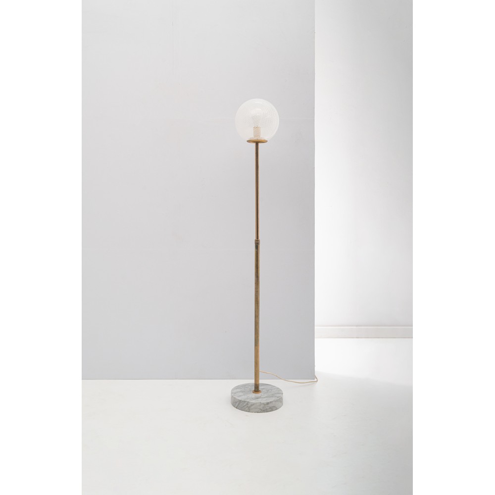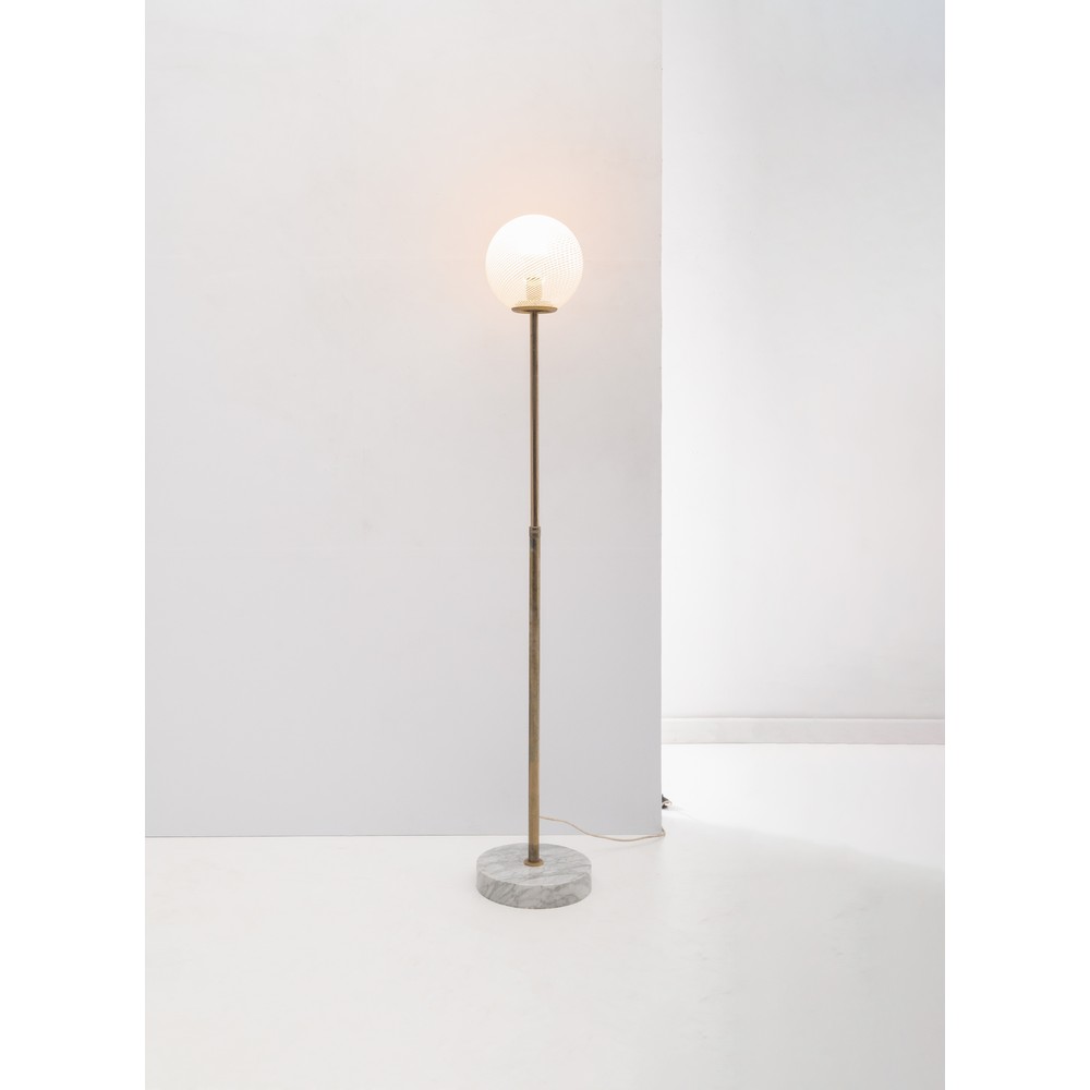 Lampada da terra ad una luce, struttura in Ottone, diffusore in vetro a spirale trasparente e lattimo.