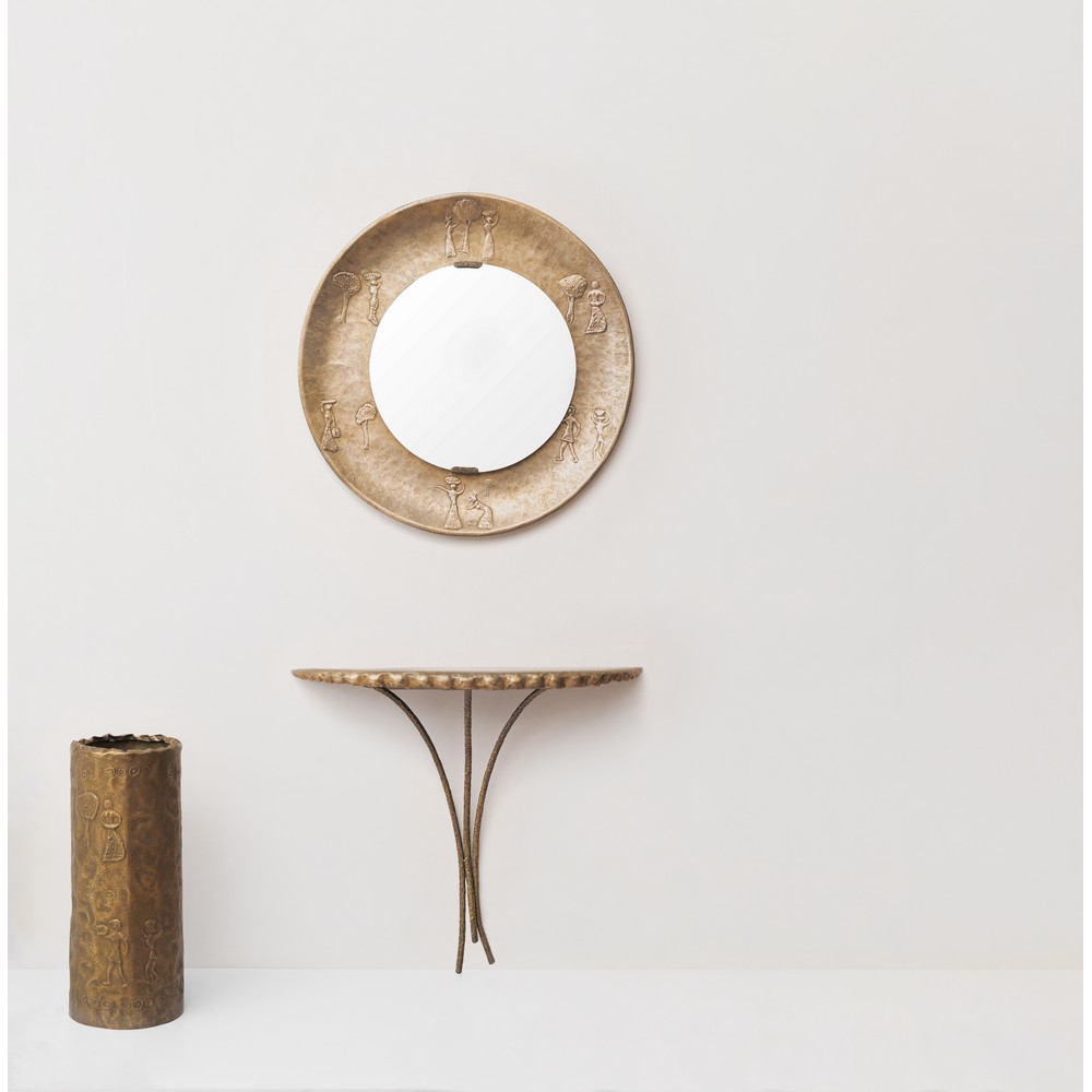 Consolle con specchiera circolare e portaombrelli in rame sagomato e lavorato a sbalzo con figure. Firma incussa.