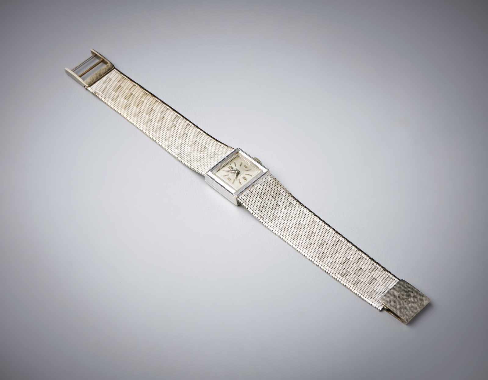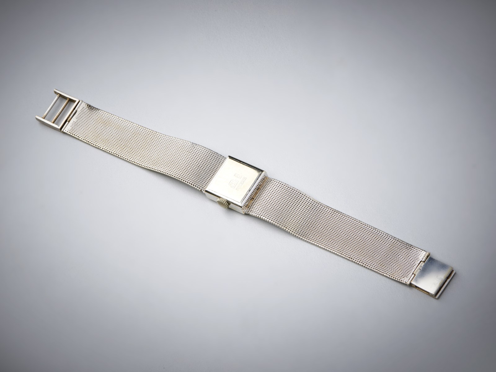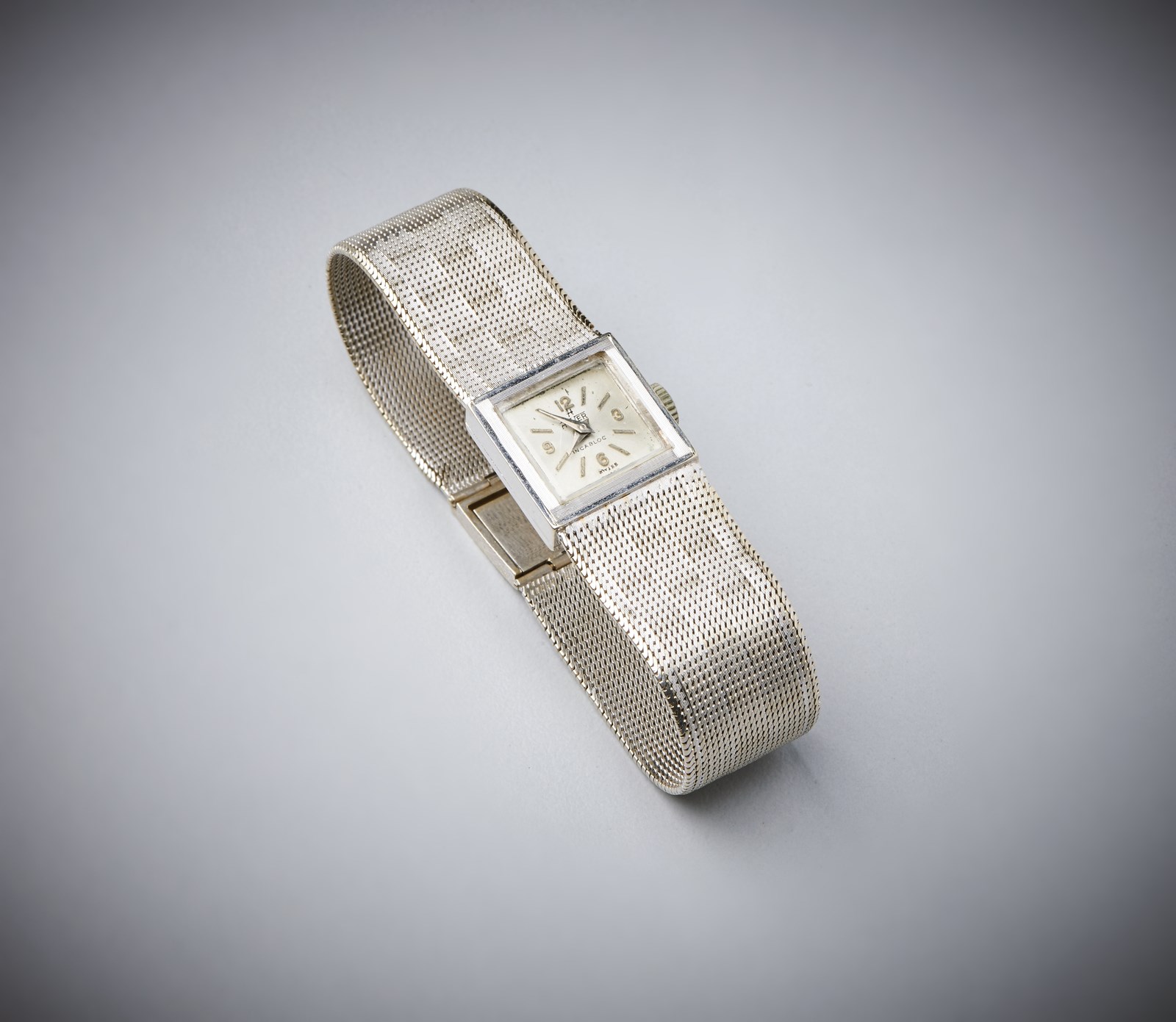 . - Orologio in oro bianco.750/1000 di forma rettangolare "Incabloc" con maglia tessita.